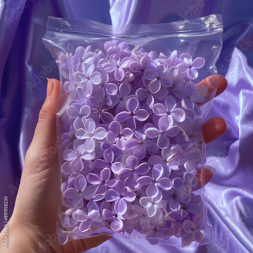 A woman's hand holds a transparent bag filled with lilac flowers.Copy space,flat lay