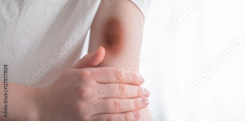 A woman's hand with hematomas after a strong impact, healing process. Bruises on the hand after injury due to soft tissue damage.