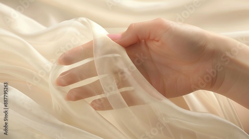 A woman's pure and delicate hands touch the soft white cotton. The soft touch is conveyed. The bright background.