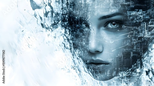 A woman's serene expression with complex circuits and lights, symbolizing the union of human emotion and digital evolution. A futuristic vision exploring the beauty of artificial intelligence and its
