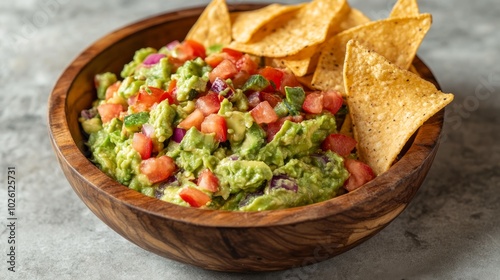 A wooden bowl filled with guacamole and topped with diced tomatoes and red onions and tortilla chips on a grey surface.
