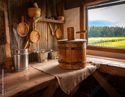 A wooden butter churn in a countryside kitchen