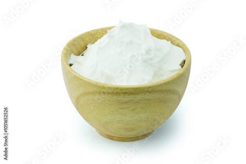 A wooden cup of Strained yogurt or Greek yogurt or Greek-style yogurt or yogurt cheese or sack yogurt or kerned yogurt, isolated on white background with clipping path close up stacking