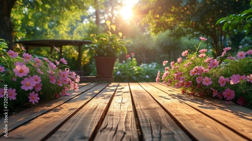 A wooden deck with vibrant pink flowers in the foreground, creating a colorful and inviting outdoor space.