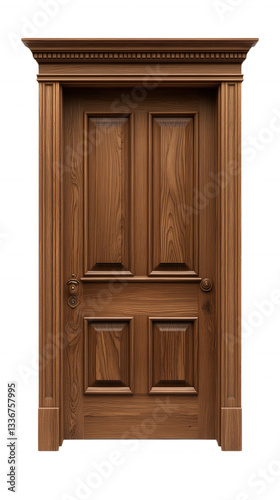 A wooden door featuring classic panel design and detailed trim, providing an elegant entrance to a space. isolated on transparent background
