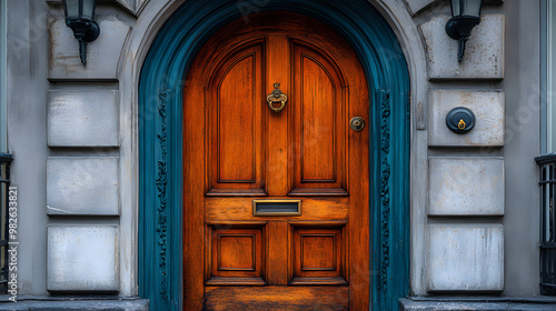 A wooden door with a brass knocker, a mail slot, and a blue trim. The door is set in a stone wall with two lights on either side.