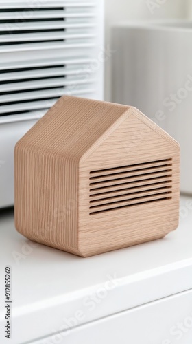 A wooden house model sits snugly in a knitted scarf atop a radiator, illuminated by gentle sunlight streaming through a window