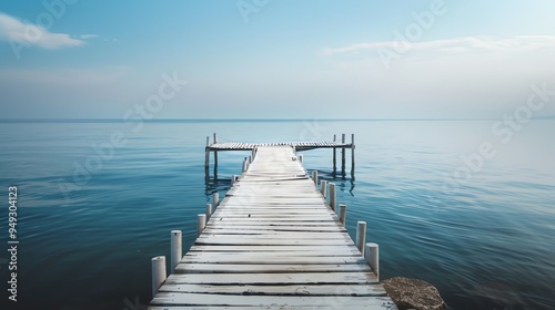 A wooden pier stretches out into a calm, blue lake.