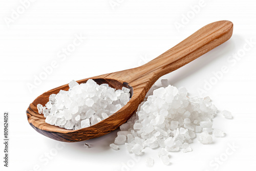 a wooden spoon filled with white salt next to a pile of white salt