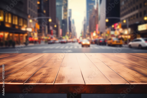 A wooden table with a city view in the background. The table is empty and the city is bustling with activity