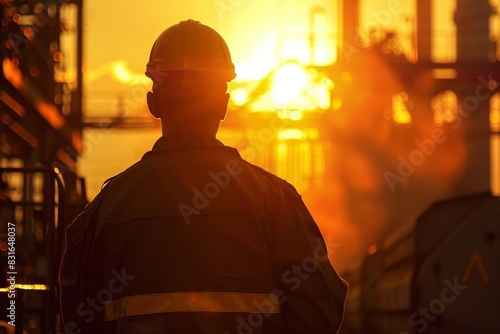 A worker in safety gear stands at an industrial site during sunset, silhouetted against the bright sun and machinery.