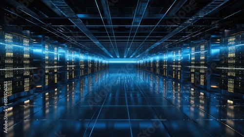 A Working Data Center With Rows of Rack Servers, Big Data Protection, Storage, Cloud Computing