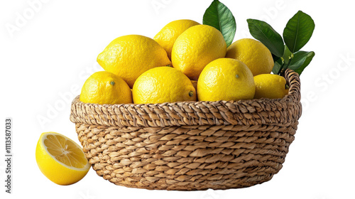 A woven basket brimming with plump, sun-kissed lemons sits gracefully on a kitchen table, radiating freshness and evoking creativity in cooking and refreshing beverages