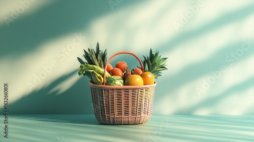 A woven basket filled with fresh fruits and vegetables against a soft backdrop.