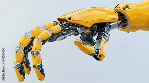 A yellow robotic hand with black and silver accents is reaching out with its fingers slightly curled.