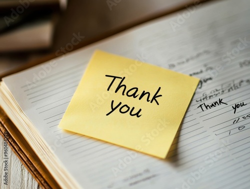 A yellow sticky note with Thank you written in simple handwriting, placed on top of an open notebook with handwritten notes in the background