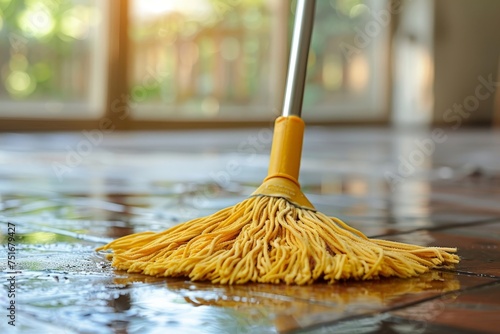 A yellow wet mop is shown cleaning a brown tiled floor, reflecting light from an open space