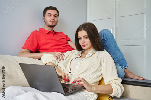 a young beautiful couple is sitting on the couch at home, a woman is doing something in a laptop, a man is behind her
