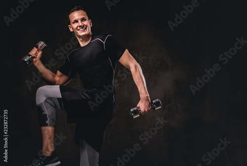 A young bodybuilder wearing sportswear doing exercise with dumbbells on dark background.