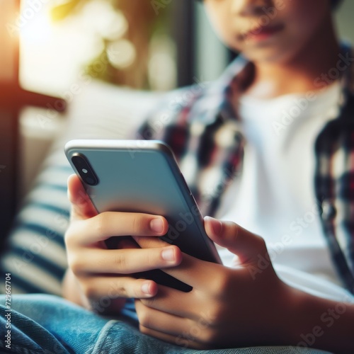 A young boy in a checkered shirt uses a smartphone, showcasing a moment of youthful engagement with technology in a homely environment.