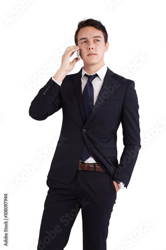A young caucasian male businessman looking unhappy holding a mobile phone looking away from camera.