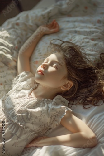 A young child resting peacefully on a bed, perfect for illustrations and editorial use