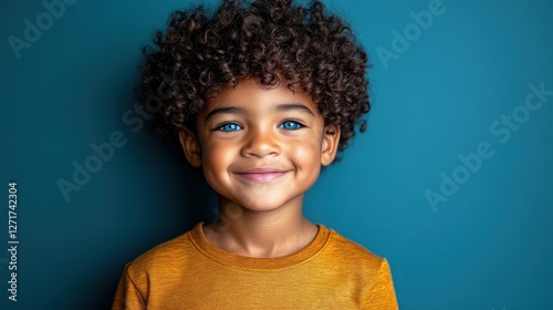 A young child with curly hair and a yellow shirt is smiling at the camera. Concept of happiness and innocence, as the child appears to be enjoying the moment