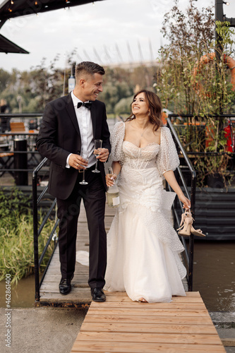 A young couple, bride and groom in wedding dresses walk across bridge, holding hands, and look at each other. wedding, happiness, joy.