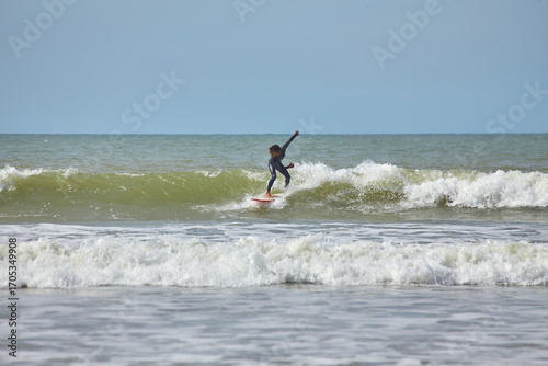 A young female surfer gracefully rides the waves on her board along the shores of Essaouira, Morocco