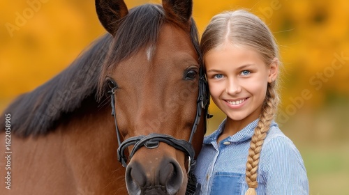 A young girl with braided hair smiling next to a brown horse outdoors in autumn