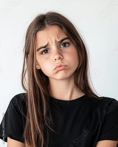 A young girl with brown hair is looking off to the side with a sad expression on her face