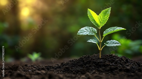 A young green plant sprouts from rich soil, symbolizing growth and renewal in nature.