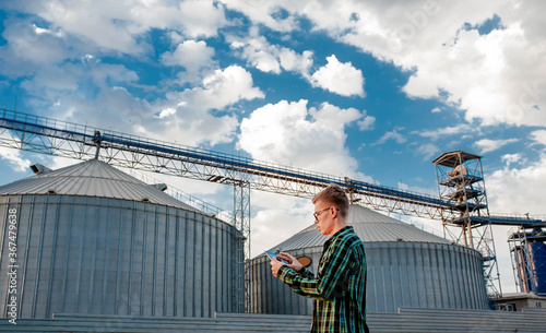 A young guy stands with a tablet near a metal elevator in an agricultural area. A grain warehouse.
