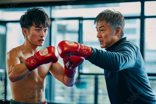 A young Japanese sportsman, wearing red boxing gloves, practices quick punches with his male coach in a sleek, modern health club. The coach, a middle-aged man, corrects his stance while they train in