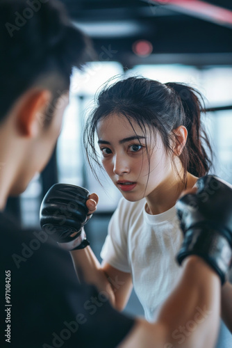 A young Japanese sportswoman, her face showing intense focus, practicing uppercuts with her male coach in a minimalist health club. The coach, a patient and skilled fighter, corrects her technique