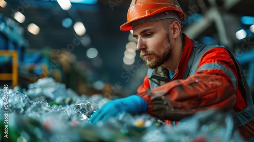 A young man at a waste recycling factory is diligently working hard in a large recycling sorting facility.