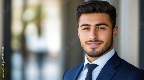 A young man dressed in a tailored navy suit and tie stands outdoors with a confident smile, showcasing a professional demeanor near a contemporary office building