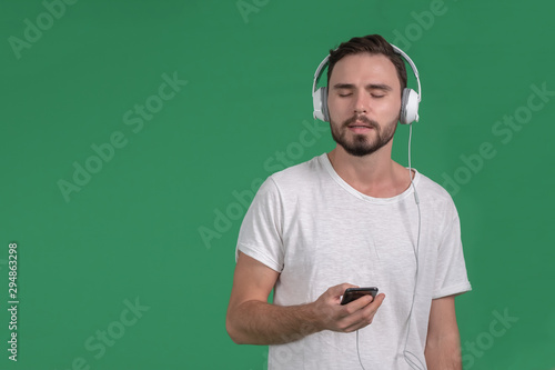 A young man listening to music with headphones isolated over green background - Image