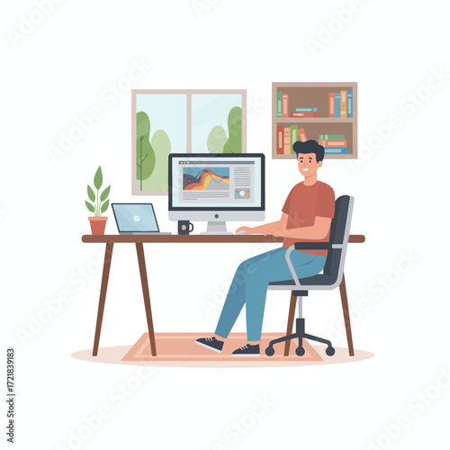 A young man smiling while working on his computer at a modern, organized home office desk.