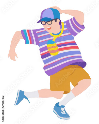 A young man wearing shorts, a striped T-shirt and a hat is dancing in the line art style