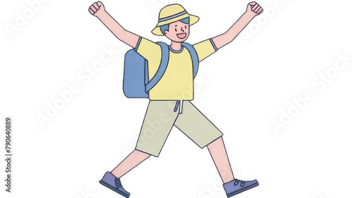 A young man wearing shorts, a yellow shirt and blue sandals is cheering with his right hand raised above his head in the style of Japanese anime.