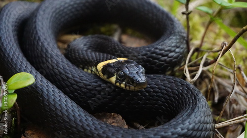 A young, small, non-venomous black snake with beautiful black scales lies on the forest green grass, moss, leaves on a spring-summer day in the forest and looks carefully ahead. Close up.