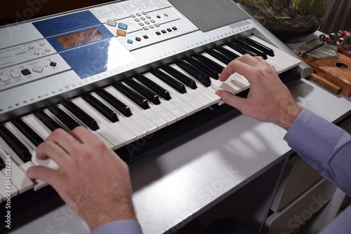 A young white man plays an electronic synthesizer indoors, immersed in his creative hobby. Focused on shaping tones and melodies, he explores musical expression and artistry in a calm home setting.