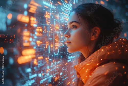 A young woman gazes at a digital interface filled with glowing data patterns.
