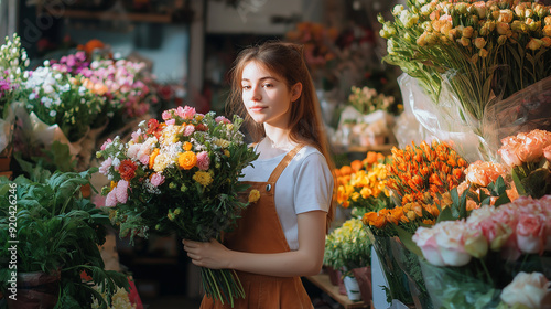 A young woman in a flower market holding a bouquet of mixed flowers, surrounded by vibrant colors and natural beauty, representing joy and abundance.