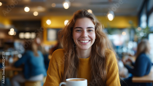 A young woman in a lively coffee shop, enjoying a cup of coffee with a friend, her smile full of warmth and strength as they share a moment of connection.