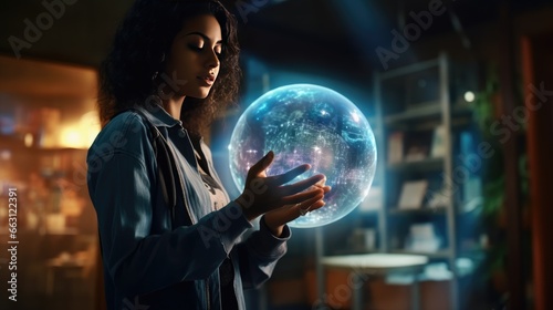 A young woman is using futuristic cutting-edge technology to view phone information and functions to display holograms around her.