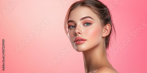 A young woman showcases radiant skin and expertly applied makeup while posing against a soft pink backdrop during a fashion shoot