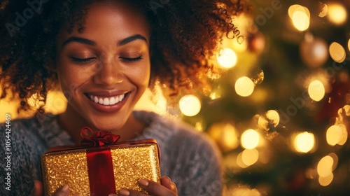 A young woman smiles brightly as she cradles a beautifully wrapped golden gift, surrounded by twinkling Christmas lights and a decorated tree, capturing a moment of holiday excitement and joy.