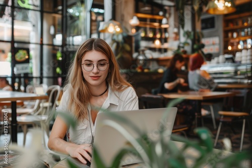 A young woman with glasses works on a laptop in a trendy cafe. The cozy interior features warm lighting and plant decor.